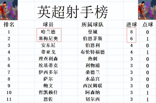 射手榜方面,6轮打入8球的哈兰德高居榜首,塞梅尼奥今天2射一传独造3球,2球之差紧追哈兰德,6球独居第2。安东尼,蒂亚戈4球并列第3。萨尔,鲍文,哲凯赖什,埃基蒂克,理查利森等人3球刚好挤入前十。