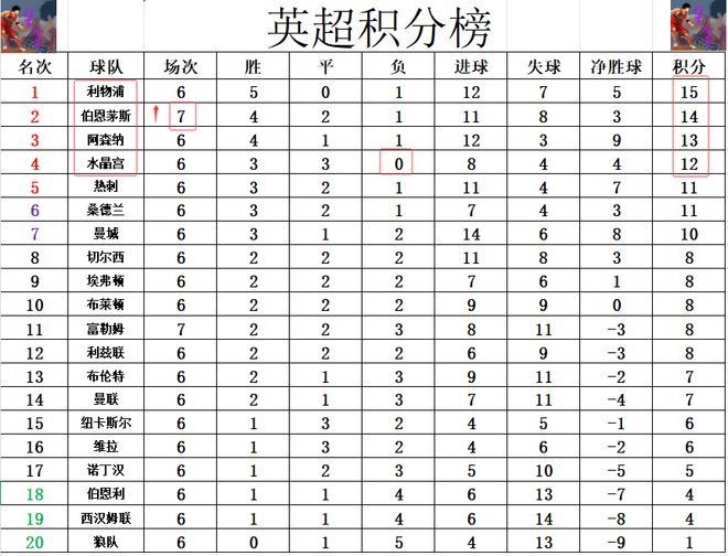 积分榜方面,利物浦上轮5连胜被终止,不过他们仍然是位列榜首,领先阿森纳2分。伯恩茅斯今天逆转绝杀富勒姆后,近6轮4胜2平保持不败,先赛的情况下超过阿森纳1分升至第2。输球的富勒姆还是多曼联1分,排在第11。