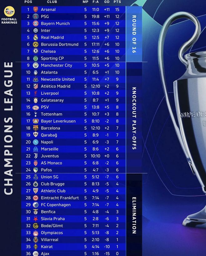 在皇马客场与奥林匹亚科斯的比赛中,皇马4-3险胜对手,维尼修斯两送助攻,姆巴佩完成皇马以及欧冠生涯首次大四喜。在目前的欧冠积分榜上,4支球队同为4胜1负的战绩,巴黎、拜仁、国米以及皇马都是12分,排名第2-5位,位列15分的阿森纳之后。